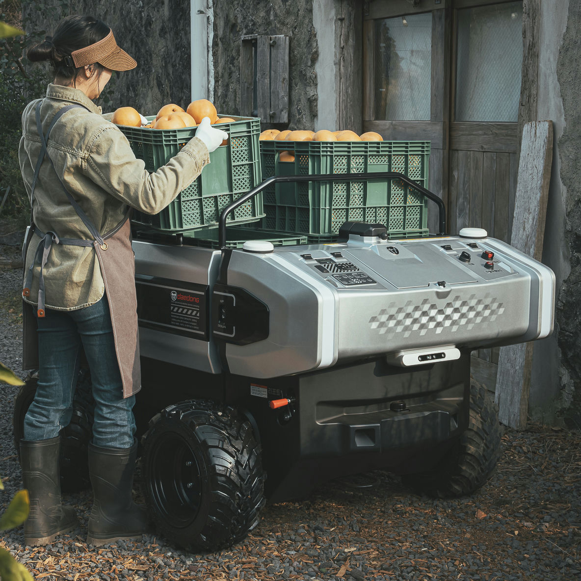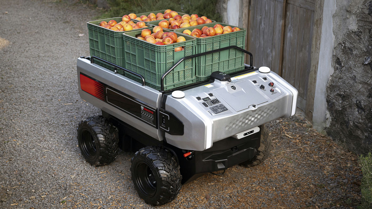 The KIOTI RT100 is a compact, electric transport robot designed to automate internal logistics in agriculture and green environments.