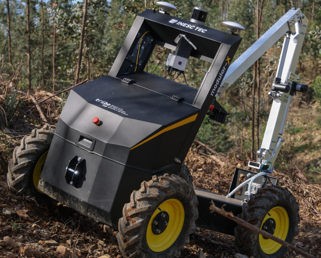 INESC TEC’s Modular Robots are autonomous, versatile machines designed for agricultural and silvicultural tasks. These robots are compatible with various trailers and tools for diverse operations. Modular E is specialised for permanent crops and features tools for mowing, both in and between rows. It can autonomously perform precise fertilisation, phenotyping using a robotic arm, and precision optical and hyperspectral sensing. A tool for fruit harvesting is currently under development. Modular X, a larger version, is designed for more challenging, irregular terrains, such as forests. It is equipped with a trailer for transporting heavy loads and a robotic arm for selecting and cutting eucalyptus branches. These robots offer flexibility, precision, and efficiency, revolutionising agricultural and forestry tasks with automation.