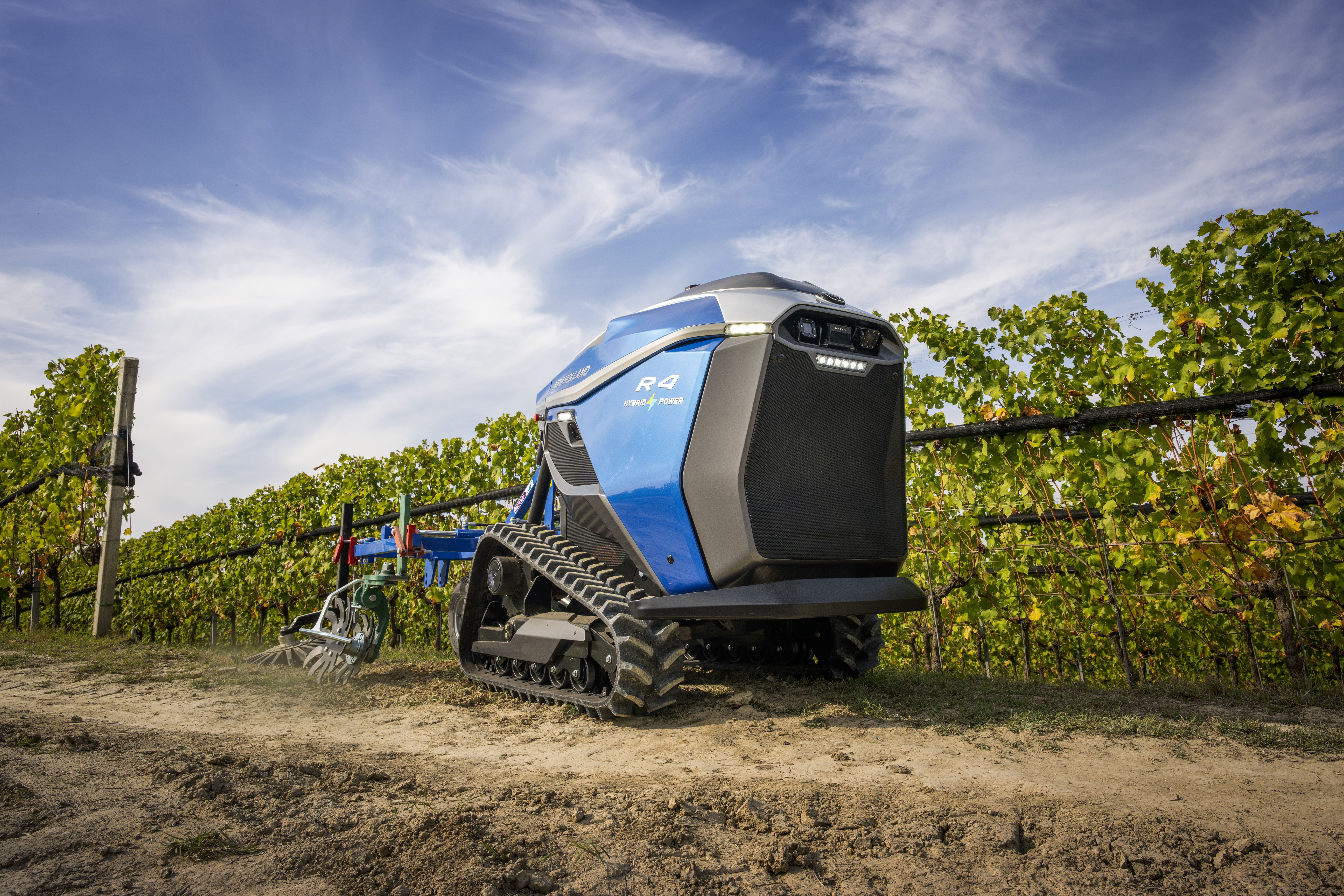 The New Holland R4 Series is an autonomous robot platform designed for vineyards, orchards and specialty crops. Developed by CNH engineering teams in Modena and Coëx, the R4 automates repetitive, labour‑intensive tasks such as mowing, tillage and spraying, helping growers address labour shortages and sustainability demands. Guided by GPS, LIDAR and vision cameras, it delivers precise, safe and remotely supervised operation. Two versions are available: the fully electric R4 Electric Power with a 40 kWh battery for narrow vineyards, and the R4 Hybrid Power, combining an HVO‑compatible diesel engine with electric drive for wider orchard rows. Both models feature rubber tracks, electric implement power and intelligent spraying functions, ensuring high efficiency, low emissions and reduced soil compaction. The R4 integrates seamlessly with New Holland’s autonomy tech stack, offering a scalable, future‑ready solution for specialty farming.